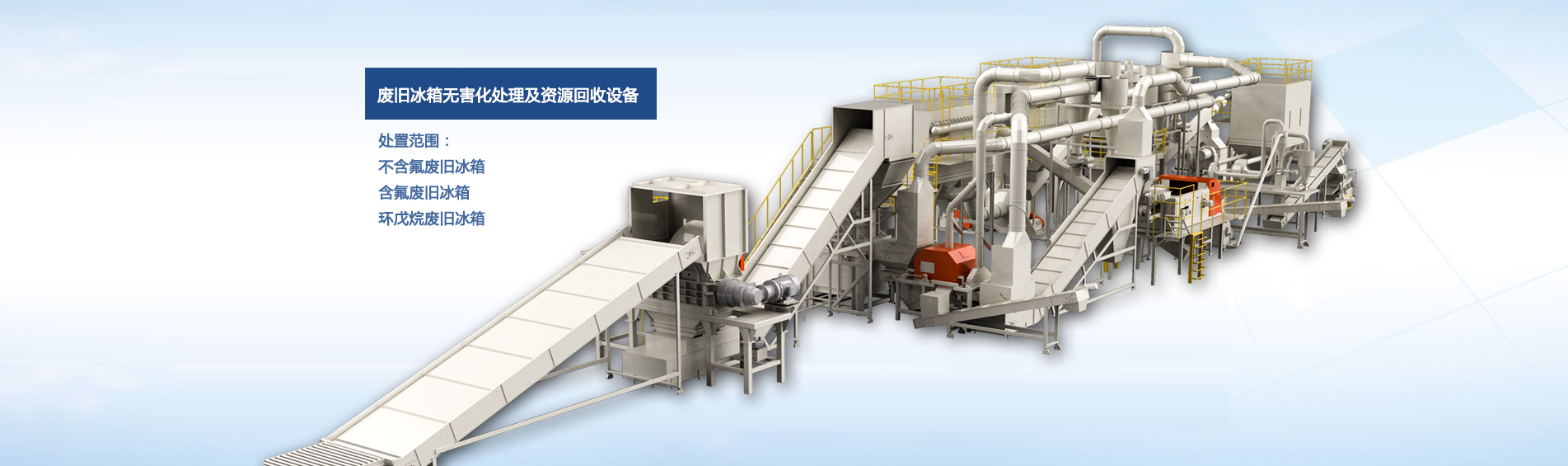 公司自主研發(fā)的廢舊冰箱無害化處理及資源回收技術及設備, 獨具 “雙軸撕碎機+立式破碎機+大風量稀釋環(huán)戊烷氣體”的專利組合設計, 主要用于對廢舊冰箱中的各種原材料進行分離、 回收和利用, 具有自主知識產(chǎn)權, 經(jīng)國家工業(yè)和信息化部科技成果鑒定為 “填補國內(nèi)空白, 達到國際先進水平” 。